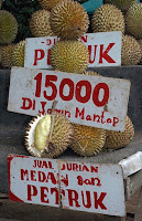 Durians in Jakarta And what a stink! Even upstairs in the bedroom with the aircon on full blast, and with a cotton handkerchief drowned in Body Shop Eau de Toilette held to my face, the stench still wafted in (I think I forgot to seal the gap below the door).